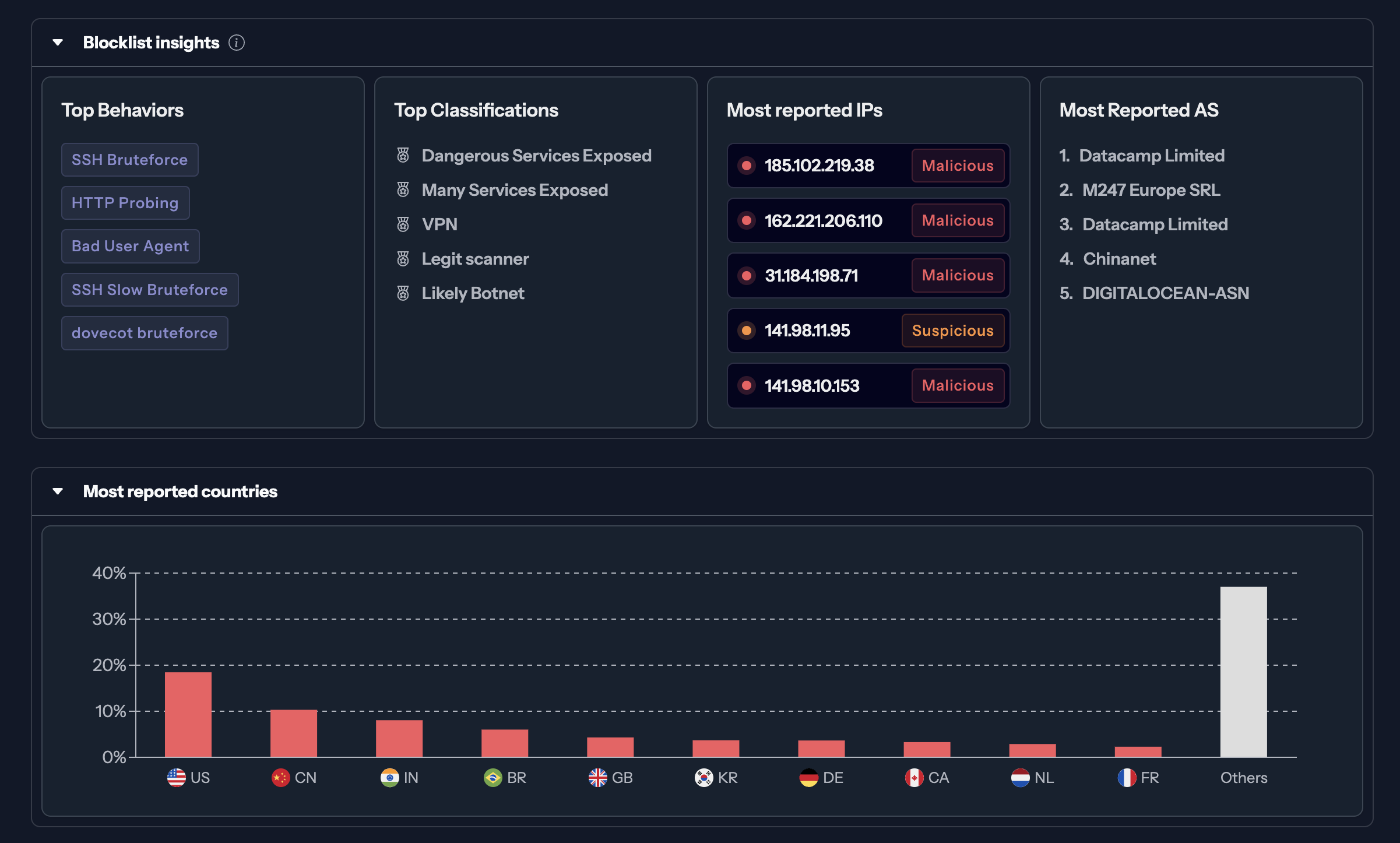 - Most reported IP's in the blocklist (You can click on the IP to search for it in the CrowdSec CTI)