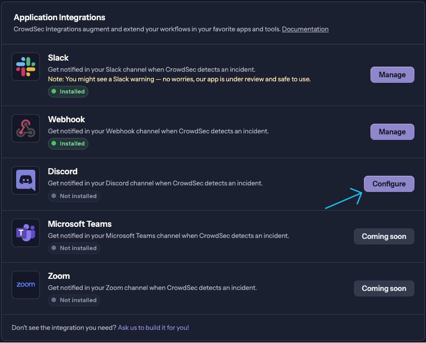 - In the CrowdSec Console, navigate to Settings > Integrations and then select Configure in the Discord row.