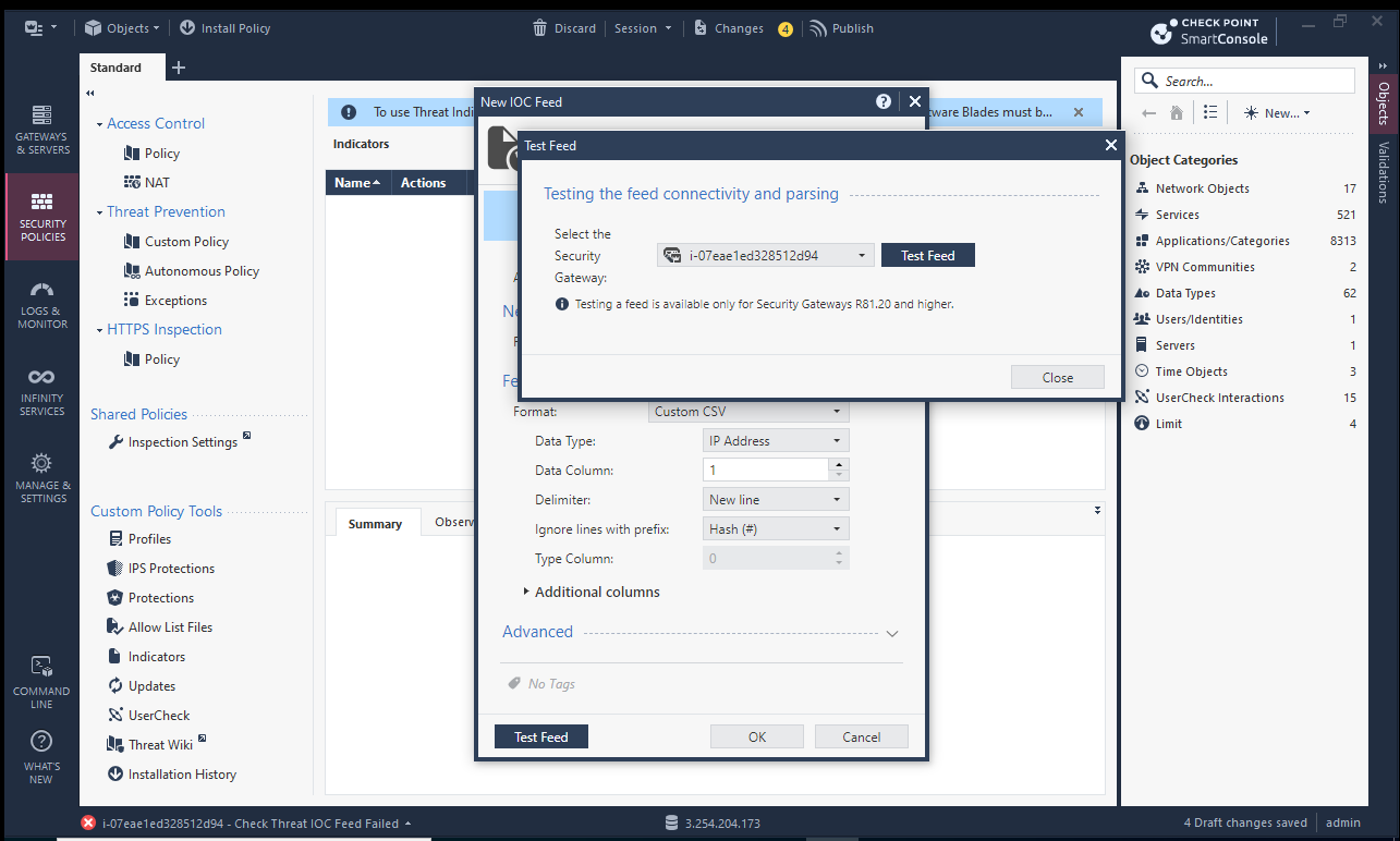 Click on "Custom Policy", then below on "Indicators". Add your feed information and click "Test Feed".
